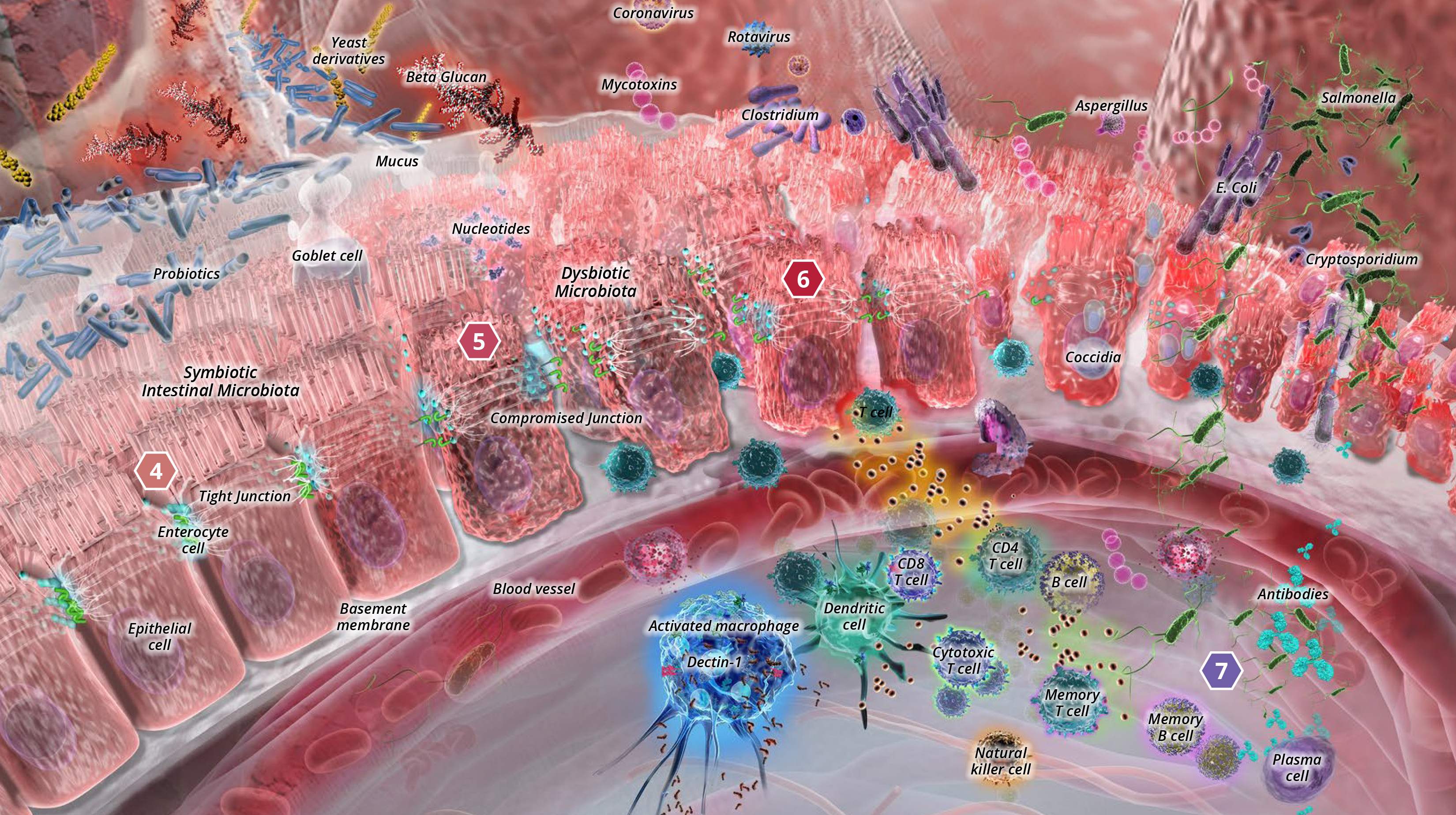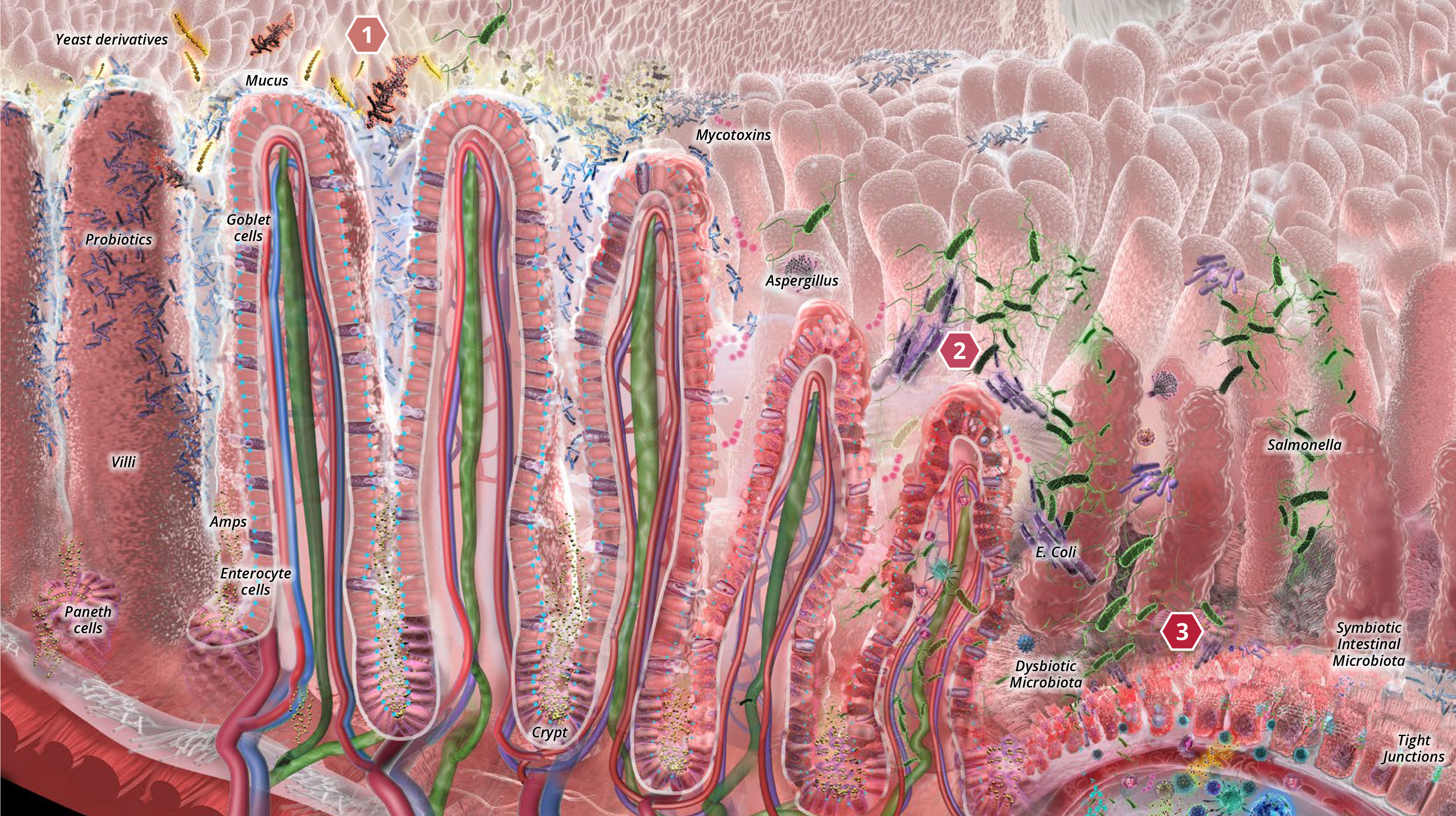 Scientists have long known that a large portion of the immune system resides within the digestive tract, home to both good and bad bacteria. Maintaining microbial balance within the digestive tract is crucial in establishing gut health. Research shows that direct-fed micro-organisms, biologically active polysaccharides and polypeptides work directly in the gut to reduce inflammation, promote epithelial growth and repair, improve nutrient absorption and establish colonization of beneficial flora in the digestive tract effectively supporting gut health and immunity